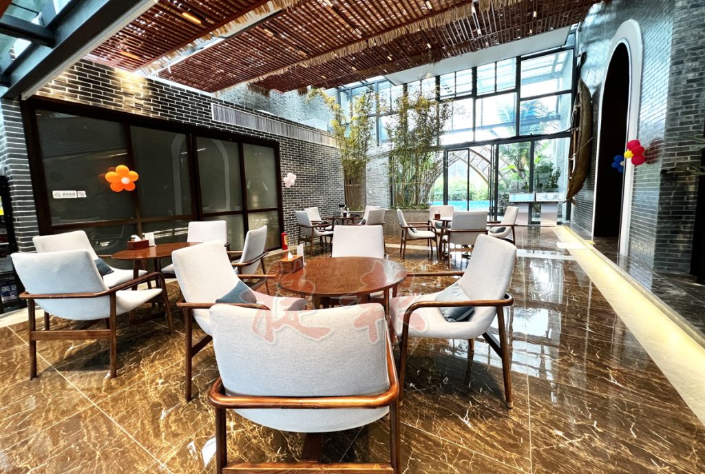 去這間酒店要乘坐建材城中間的專享電梯才能到達,出電梯後給人的耳目一新感覺,真難想像眼前的景象。酒店的大堂連接咖啡室,旁邊就是網紅打卡點的游池,池內有一隻天鵝水泡,明明白白地告訴你這裡是玩水的地方。