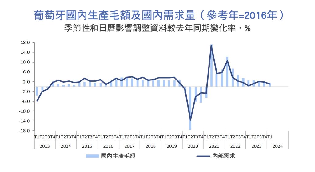 據葡萄牙國家統計局(Instituto Nacionalde Estatística,簡稱:INE)於5月20日發表的經濟調查報告指出,根據季度國民經濟會計的快速估算,2024年第一季實際GDP年比變動為1.4%(上一季為2.1%)。一季內需對GDP年比變動的正向貢獻下降,投資和私人消費放緩。淨外部需求對國內生產毛額年增率變動的貢獻在上個季度為正值後為零,其中貨物和服務出口量下降,貨物和服務進口小幅增長。