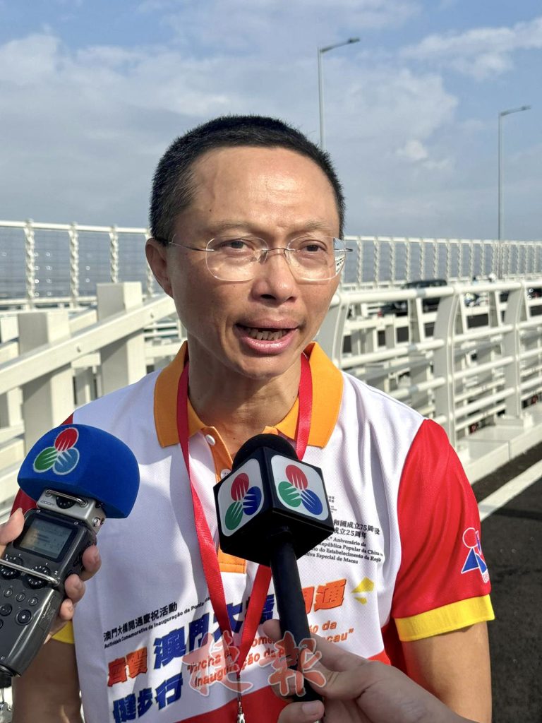 澳門大橋將於10月1日(周二)下午2時起通車,為熱烈慶祝中華人民共和國成立75周年及澳門特別行政區成立25周年,體育局昨在澳門大橋開通前舉辦「齊賀澳門大橋開通健步行」,2.1萬人參與,參加者沿大橋打卡留念,氣氛熱鬧。大橋通車在即,交通局局長林衍新表示,澳門大橋設有200多個監控系統,形容近乎「無死角」覆蓋,希望駕駛者使用大橋時嚴格遵守交通法規。