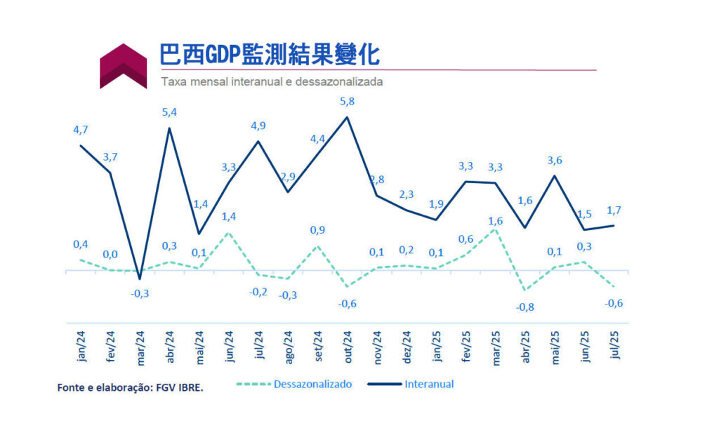 巴西瓦加斯基金会經濟研究所(FGV IBRE)於9月16日發布第118期《GDP監測報告》(Monitor do PIB),數據顯示2025年7月巴西經濟活動經去季節調整後,環比(與 6月相比)萎縮0.6%;同比(與2024年7月相比)則增長1.7%,截至7月的移動季度同比增幅為2.2%,過去12個月累計增幅為2.9%。報告指出,農牧業、工業產出下滑,以及家庭消費、固定資本形成(投資)減少,是拉動本月經濟收縮的主要原因,僅服務業維持微弱正增長,展現一定韌性。
