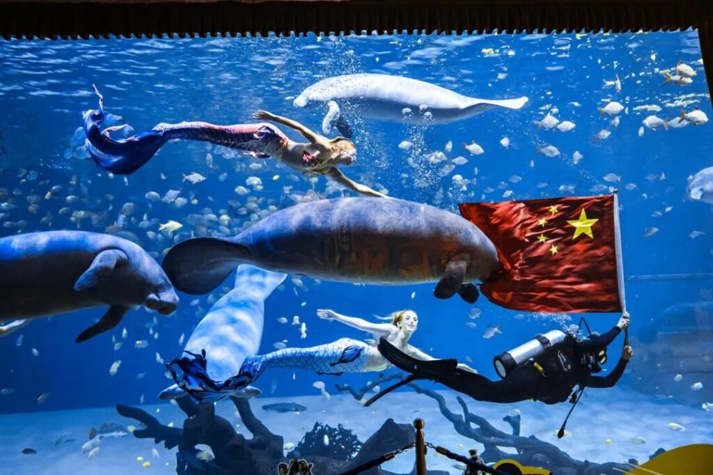 長假期間,橫琴多個主題樂園引領熱潮,長隆海洋王國、星樂度·露營小鎮等傳統熱門項目依然人氣爆棚。長隆海洋王國鯨鯊館內精心佈置的水下國旗與愛國橫幅,營造出獨特的深海獻禮場景。星樂度·露營小鎮推出秋日「玩火」主題派對,非遺打鐵花、噴火特技、「鳳凰于飛」表演以及篝火晚會等吸引大量親子家庭。