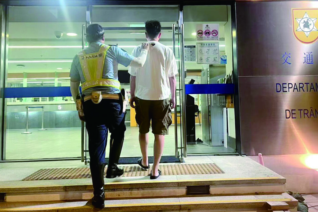本澳一名男子早前涉嫌醉酒駕駛並撞毀五個鐵欄、一組交通燈及石壆等公物後棄車逃去,治安警接報到場調查,約一小時後在黑沙環中街拘捕男嫌犯。