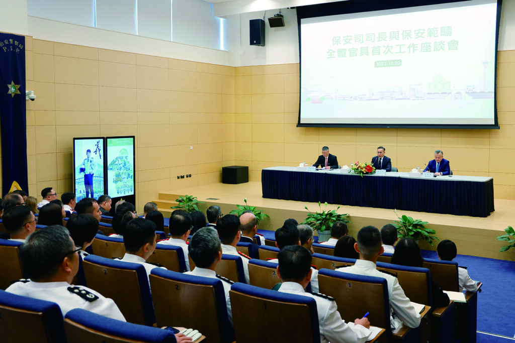 澳門保安司司長陳子勁20日上午在治安警察局總部大樓主持召開保安範疇的工作座談,參與座談包括警察總局局長梁文昌及海關關長何浩瀚,以及保安範疇全體領導主管。會上,陳子勁總結過去的工作成果、傳達施政理念及對未來工作方向作出部署。