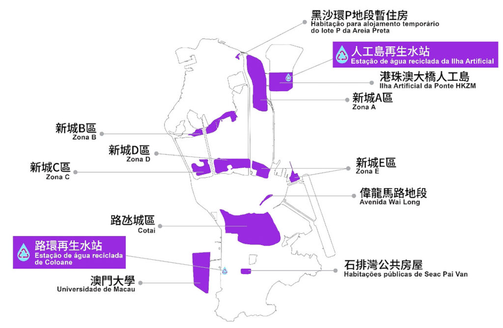 為便於辨識,澳門再生水管採用紫色,與自來水管的白色、銀灰色或黃銅色明顯區分。目前,海事及水務局正積極推進再生水建設。路環再生水站一期工程正在施工,預計2026年第一季竣工,每日供水能力達2,500立方米,將率先供應石排灣公屋及澳門大學,用於沖廁和綠化用途。二期及人工島再生水站亦計劃於2026年第一季啟動編製工作。