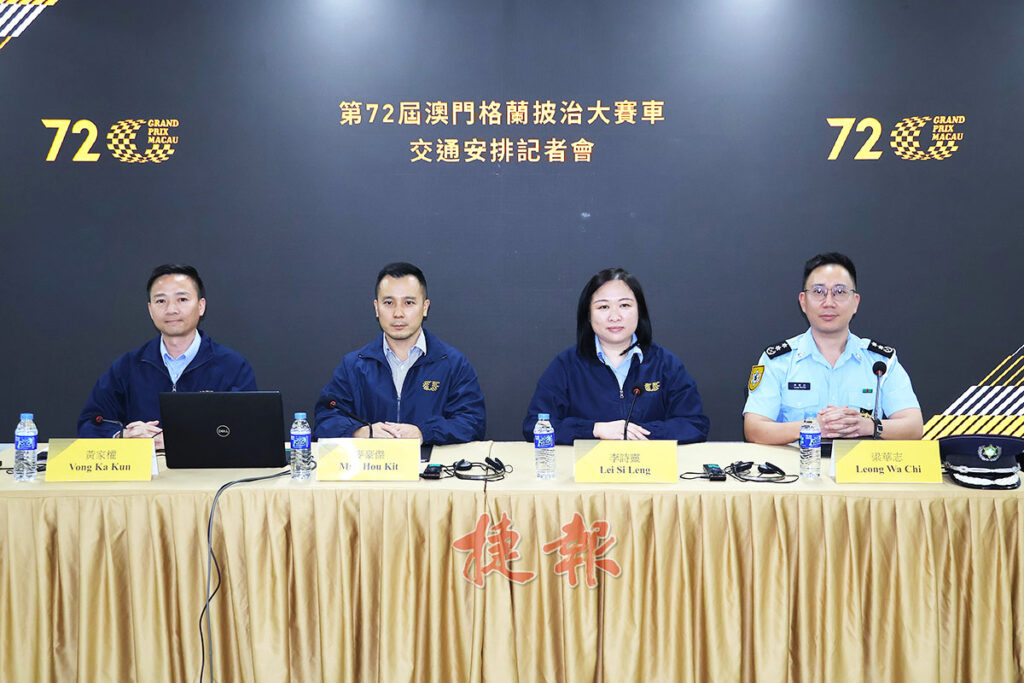 體育局代局長、大賽車組委會協調員李詩靈,治安警察局交通廳代廳長梁華志,交通事務局協調處處長麥豪傑,大賽車組委會基建專責小組組長黃家權昨舉行新聞發布會,介紹大賽車期間交通安排。