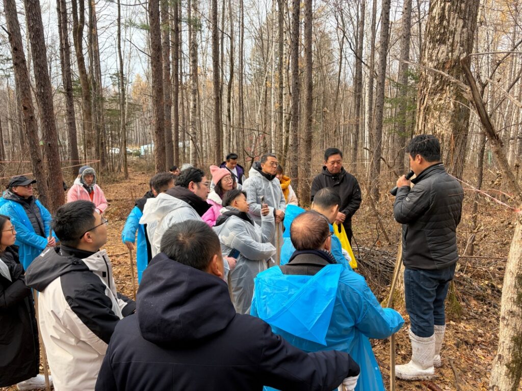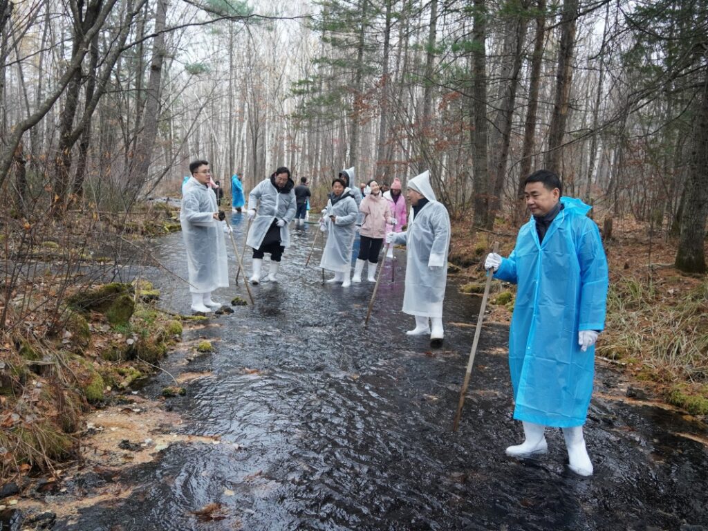 隨後,一行前往長白山鹼水河國家濕地公園林下參基地,在基地工作人員引導下,瞭解人參的種植歷史與藥用價值,並參與「溯溪+挖人參」體驗活動。團員們換上溯溪雨靴,手持木棍,一邊在冰涼清澈的溪水中緩步前行,一邊瞭解長白山原始森林內的奇珍異寶。在林下參採挖區域,團員們手持鹿骨及塑料小鏟,在工作人員手把手指導下,小心翼翼地挖掘人參,感受傳統採參文化的精髓。