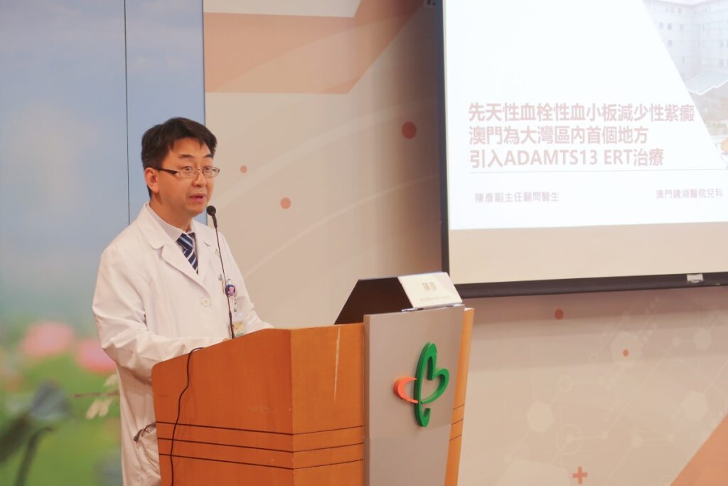 及後,兒科副主任顧問醫生陳彥介紹該疾病相關病理及以往一般療法,並詳細介紹ERT療法。他指出,鏡湖醫院公布的澳門首例個案為一名現時14歲零兩個月的男性患兒。患者早年足月順產,出生後25小時出現皮膚黃染加重,過去共7次因感染後發熱及血小板減少入院,2017年入院時外周血塗片可見較多碎片紅細胞。目前該患者情況穩定,日後若急性發作,有機會應用最新ERT治療,成為澳門首宗使用個案。