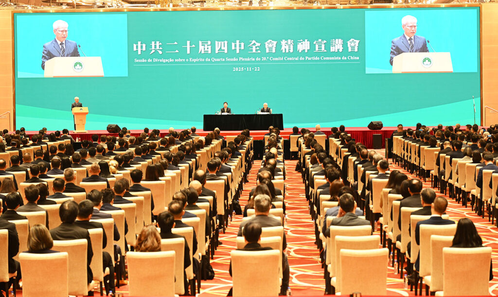 22日下午,澳門特區政府繼續舉辦第二場「中共二十屆四中全會精神宣講會」,面向社會各界人士代表。行政長官岑浩輝、全國政協副主席何厚鏵、中央人民政府駐澳門特別行政區聯絡辦公室主任鄭新聰、前任行政長官賀一誠、澳區全國人大代表和全國政協委員,以及社會各界代表約600人出席了會議。