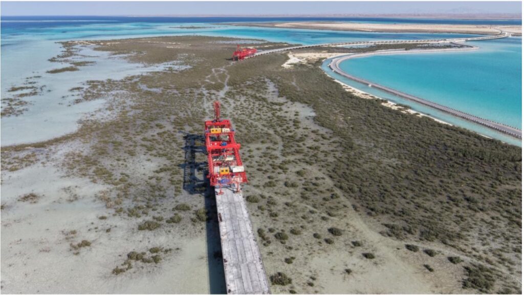 在4號橋施工中,項目團隊創新性提出了「全預製結構橋梁+樁梁一體機」的綠色解決方案。自主研發「紅海願景1號」「紅海願景2號」智能造橋裝備,實現施工裝備全程避讓地表,大幅減少對紅樹林生態的影響,在紅海區域樹立綠色施工標桿。「這是中東地區首次投用樁梁一體機。使用這套自主研發的智能造橋裝備,我們能在架橋施工的同時保護當地生態環境,實現了施工效率和經濟效益的雙提升。」項目相關負責人李偉偉介紹道。