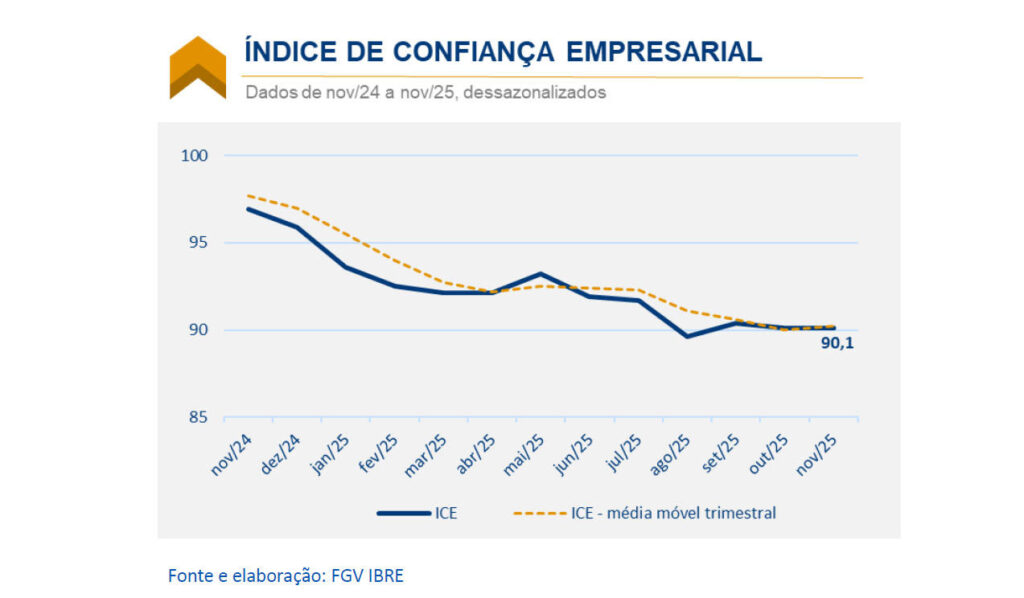 11月份,FGV IBRE的企業信心指數(ICE)穩定在90.1點。儘管如此,若以季度移動平均數來衡量,該指數在連續五個月下跌後,再次呈現上升趨勢,小幅上升0.2點。