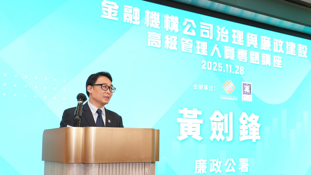 講座上,廉政公署代表和金管局代表,分別圍繞金融廉政防綫及合規發展、信用機構及保險業公司治理的重點要求、行為守則制定與執行、廉潔文化的推廣,以及利益衝突處理等關鍵議題進行深入闡述。活動設有答問環節,三位講者就各金融機構代表提出的問題,作出回應與建議。