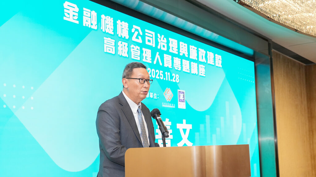 金管局行政管理委員會代主席黃善文在致辭時表示,金融體系的穩健與誠信不僅關乎市場有效運作,更直接影響社會公眾的切身利益與對整個金融體系的信心。澳門作為國際化城市,其金融市場聲譽是開展對外金融合作,對接內地與國際金融市場,並在國際舞台上展現更大作為的重要基石。金融機構高級管理層應以身作則,樹立廉潔的營商文化。同時,嚴謹的內部監控機制是不可或缺的防線。他強調,每位金融從業員的個人操守,是守護金融廉潔誠信的最終屏障,期望從業人員除具備專業的知識與技能,更須恪守最高的道德標準,在面對利益衝突或不正當利誘時堅守依法合規、廉潔誠信的底線。