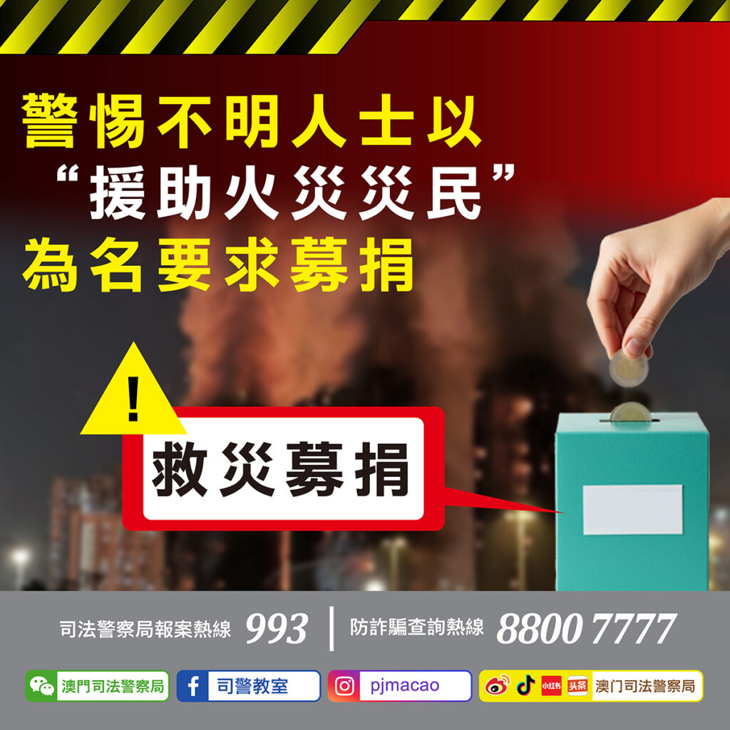 近日,司警局接獲商會代表反映,有自稱來自香港慈善機構的人士前往本澳商店募款,聲稱所籌得款項將用於援助火災受災居民。由於鄰近地區已出現藉募捐賑災為名的詐騙案件,司警局提醒公眾必須提高警惕,慎防不法分子進行詐騙。