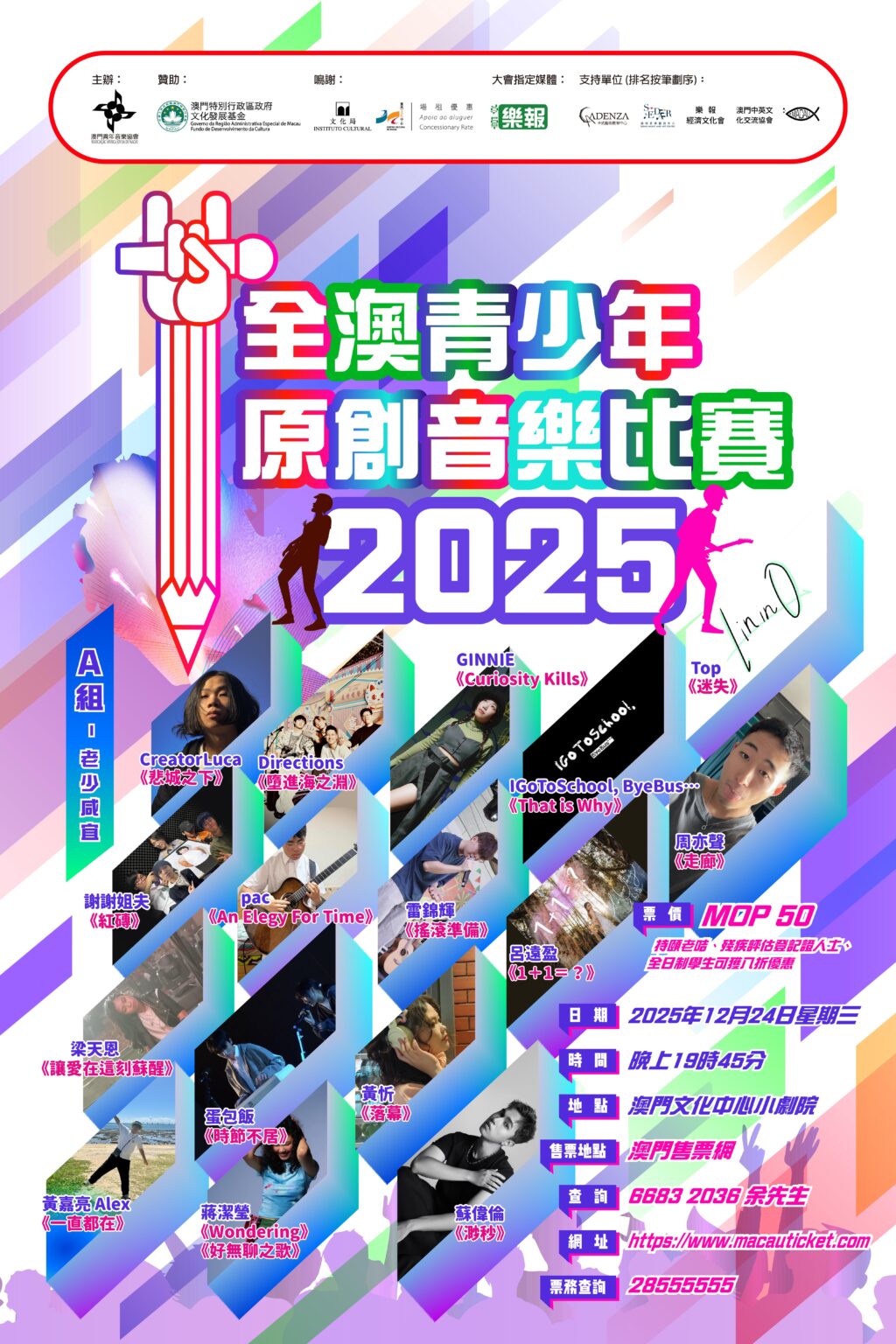 由澳門青年音樂協會主辦、澳門特別行政區政府文化發展基金資助,獲澳門文化局澳門文化中心場租優惠的《全澳青少年原創音樂比賽2025》,將於12月24日晚上7時45分,於澳門文化中心小劇院舉行,屆時將即時公佈晉身決賽的8首歌曲,爭奪冠亞季等獎項。