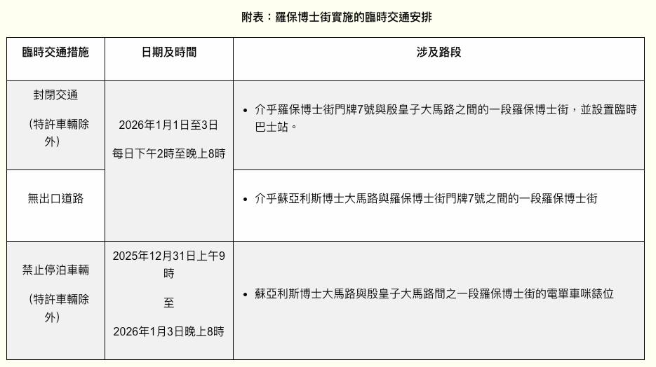 為加強元旦假期乘搭巴士服務的人流疏導安排,交通事務局與巴士公司協調,於2026年1月1日至3日每日下午2時至晚上8時,對前往關閘方向的巴士停靠站點實施臨時分流安排,屆時3及3X路線將不停靠「新馬路/華僑」站,改停設於殷皇子大馬路(近羅保博士街)之臨時站;為配合有關安排,羅保博士街一帶將實施臨時交通管制措施,詳情請見附表。