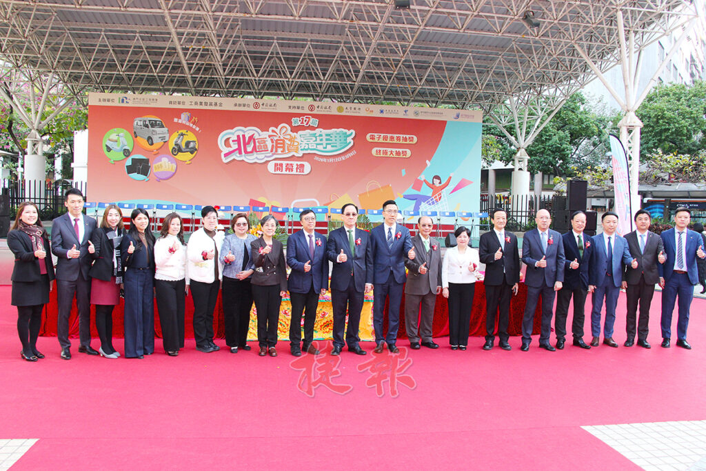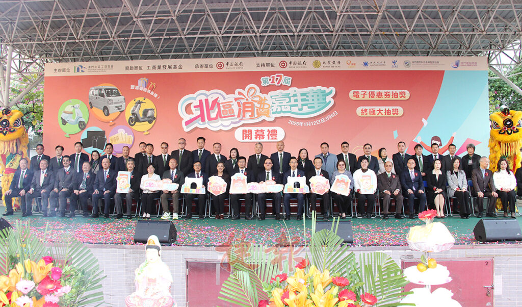 由澳門北區工商聯會主辦、工商業發展基金資助的「第十七屆北區消費嘉年華2026」昨在祐漢公園舉行揭幕禮,中聯辦經濟金融部副部長楊全州、經科局局長邱潤華、旅遊局局長文綺華、全國僑聯副主席及澳門行政會委員劉藝良、經科局產業發展廳廳長劉傑麟、中總理事長馬志毅、北區工商聯會會長黃健中、北區工商聯會永遠榮譽會長陳明金、街總會長吳小麗、婦聯會長劉金玲等出席並主禮。