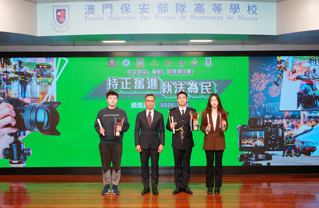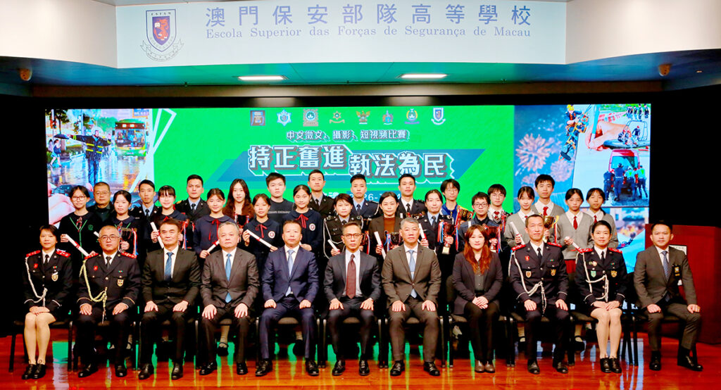 由澳門保安部隊及保安部門合辦、澳門保安部隊高等學校(下稱「保安高校」)承辦的「持正奮進 執法為民」中文徵文、攝影及短視頻比賽,昨日在保安高校舉行頒奬禮。保安司司長陳子勁擔任主禮嘉賓,並邀請中聯辦警務聯絡部部長王前進、警察總局局長梁文昌、澳門海關關長何浩瀚、校董會成員、保安部隊及保安部門各領導、學術及教學委員會成員、賽事評委、各組別的得獎者,以及高等院校和中學代表等約180人出席,共同觀賞各位得獎者的精彩作品和見證榮耀時刻。