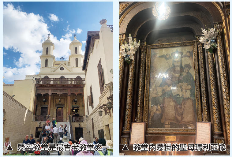 •懸空教堂:是一座精巧的科普特教堂,位於開羅老城,其象牙鑲嵌的聖壇螢幕和大理石講壇極具欣賞價值。
