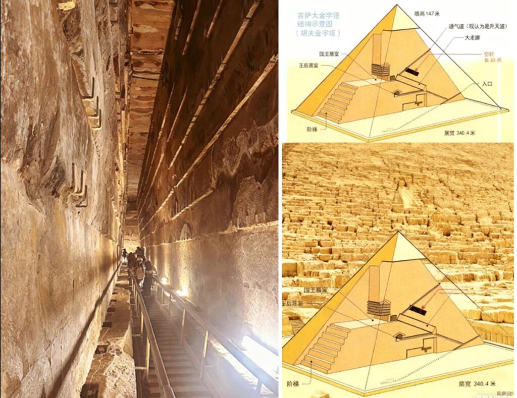 金字塔內部結構暗藏玄機,通道與墓室的佈局嚴謹有序。胡夫金字塔內有下降通道通向地下墓室,上升通道連接大走廊與法老墓室、王后墓室,其中大走廊長約47米、高8.5米,頂部疊澀拱結構極具力學智慧,法老墓室的通風通道被認為是靈魂升天的象徵。哈夫拉金字塔有兩個北坡入口,通道交錯通向主墓室;孟卡拉金字塔則以地下墓室為主,通道設計簡潔,部分未完工的盲道留存著建造痕跡。