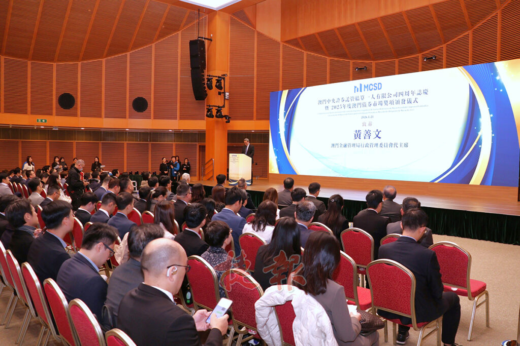 澳門中央證券託管結算一人有限公司四周年誌慶暨「2025年度澳門債券市場奬項頒發儀式」昨上午在科學館舉行,經濟財政司司長戴建業、中聯辦經濟金融部副部長楊全州、金管局行政管理委員會代主席黃善文、政策研究和區域發展局局長張作文、警察總局金融情報辦公室主任朱婉儀、公共資產監督管理局代局長廖志漢、金管局行政管理委員會委員兼MCSD董事會主席劉杏娟、橫琴粵澳深度合作區金融發展局副局長鮑偉春、迅清結算有限公司CSD發展及營運部主管吳偉,以及政府部門、行業公會、境內外金融機構、企業、律師及會計師事務所等約150名嘉賓出席活動。