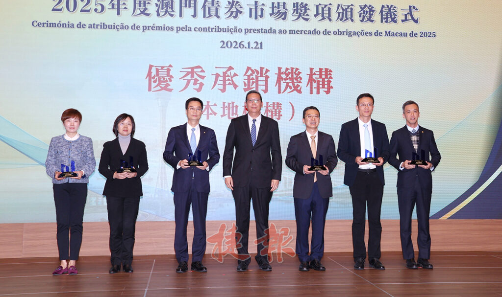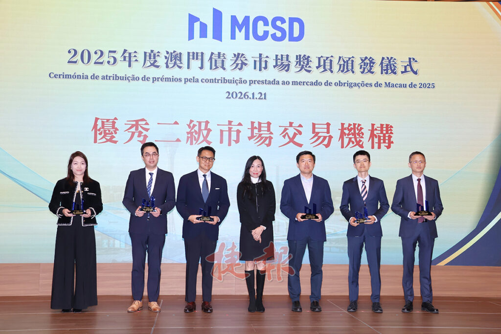 為嘉許在2025年對澳門債券市場作出貢獻的市場參與者, MCSD於活動上頒發8個獎項,包括原有的「優秀承銷機構」、「優秀發行機構」、「優秀專業服務機構」、「卓越市場合作夥伴」和「優秀市場推廣機構」,以及新增的「領先合作夥伴」、「卓越市場貢獻獎」以及「優秀二級市場交易機構」,共有29家本地及外地機構獲獎。
