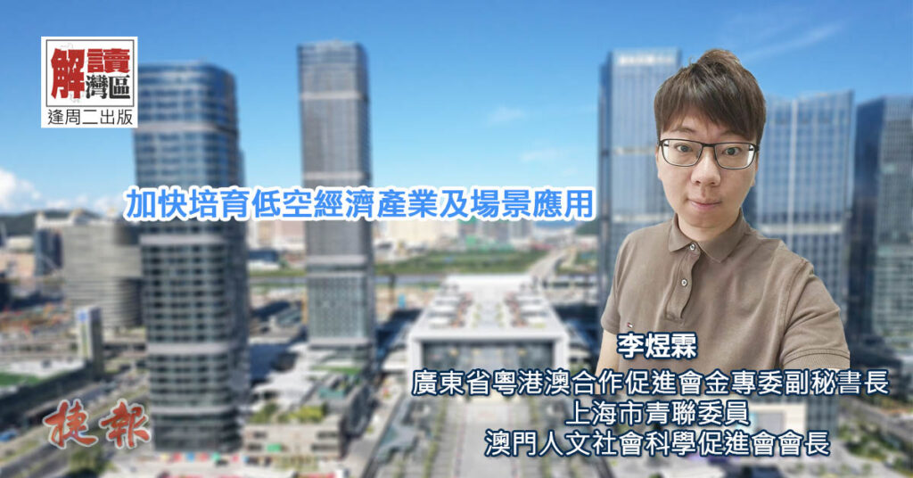 為落實《廣東省推動低空經濟高質量發展行動方案(2024-2026)》要求,關於《廣東省支持低空經濟高質量發展若幹措施》已經發布,當中包含了低空安全、研發、適航審定、基礎設施、應用場景等多個方面,當中在拓展多元化應用場景方面,相關《措施》鼓勵探索低空經濟與各行各業的深度融合。 面對低空經濟的發展趨勢,澳門應該經濟開展深化各項研究,將屬於在低空經濟的「澳門研發」優勢,融入到粵港澳大灣區低空經濟的產業發展當中,並保持持續競爭力。