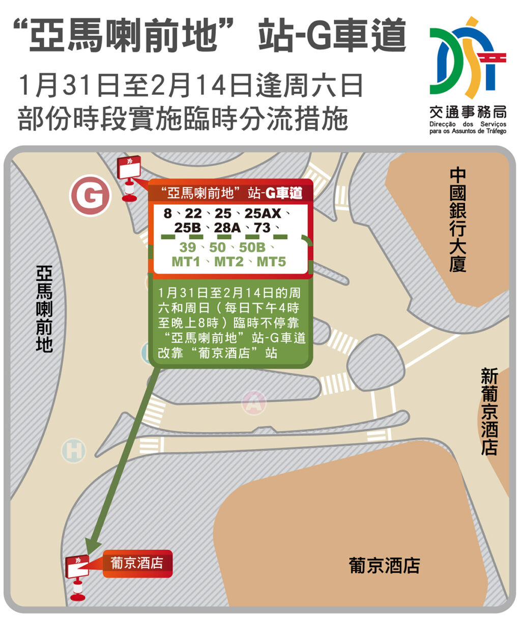 為應對農曆新年前客流增多的情況,“亞馬喇前地”站-G車道的部份巴士路線於1月31日至2月14日的周六和周日(每日下午4時至晚上8時)改靠“葡京酒店”站。交通事務局已指示兩巴增派人員及增加臨時指示,以提示乘客有關安排,並會留意客流情況,適時增加班次。