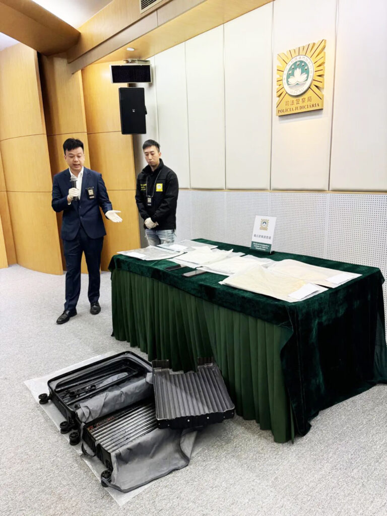 1月31日,司警毒品罪案調查處根據情報及風險排查,鎖定一名可疑的內地男乘客。當日,該男子持中國護照乘坐航班從國外抵達澳門。在澳門海關及治安警察局的配合下,司警人員在該男子提取寄艙行李箱時展開截查行動。