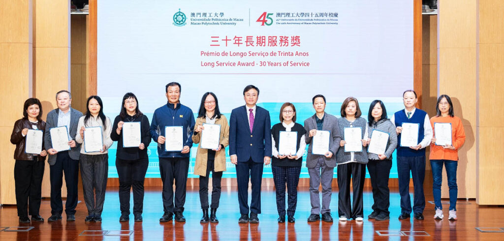 為表彰長期服務員工的卓越貢獻與教學創新教師的傑出表現,澳門理工大學舉行「長期服務獎暨優秀教學獎頒獎典禮」,向於澳理大服務滿10年、20年及30年的員工頒發「長期服務獎」以及向獲獎教師頒發「線上教學優秀案例獎」。澳理大行政管理委員會成員、學術及行政單位主管,以及教職員工共200多人出席,場面歡欣感人。