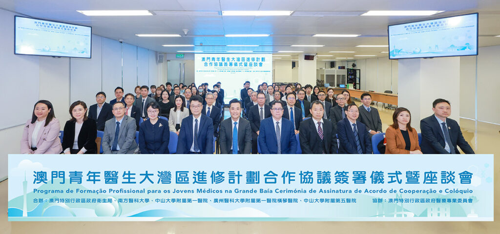 為落實特區政府的施政方針,提升本澳青年醫生專業技術能力、職業競爭力及擴闊發展空間,助力其更好地融入國家發展大局,並推動本澳醫療技術進步,實現建設「幸福澳門」的施政願景。衛生局與中山大學附屬第一醫院、中山大學附屬第五醫院、南方醫科大學、廣州醫科大學附屬第一醫院橫琴醫院合辦,由醫療專業委員會協辦的《澳門青年醫生大灣區進修計劃》,日前舉行合作協議簽署儀式暨座談會。