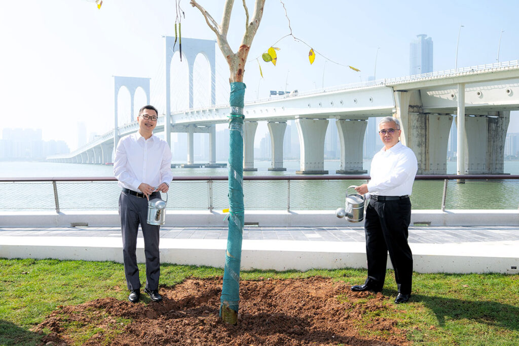 為響應3月12日中國植樹節,市政署於南岸海濱綠廊舉辦植樹活動,行政法務司司長黃少澤、司長辦公室主任曾翔、市政署市政管理委員會主席周偉迎、市政諮詢委員會主席許樂敏等嘉賓聯同近60名師生,一起種植苗木以美化澳門海岸,共同倡導「愛綠、植綠、護綠」的理念。