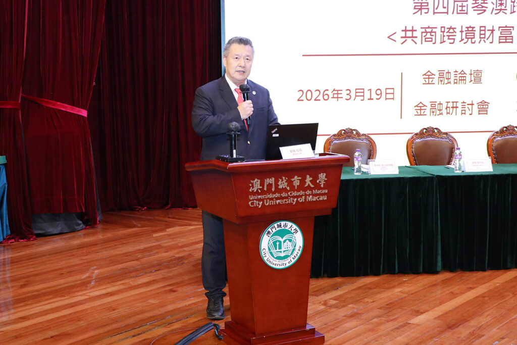 為慶祝澳門城市大學45周年校慶,城大昨(19)日在氹仔校區舉辦「第四屆琴澳跨境金融論壇」,以「共商跨境財富管理協同發展」為主題,匯聚琴澳金融業界各大金融機構與協會的行業代表及專家,共同商討琴澳跨境財富管理如何在未來更好地發展。城大校長劉駿、澳門金融管理局行政管理委員會委員劉杏娟及橫琴粵澳深度合作區金融發展局局長池騰輝出席活動並致辭。