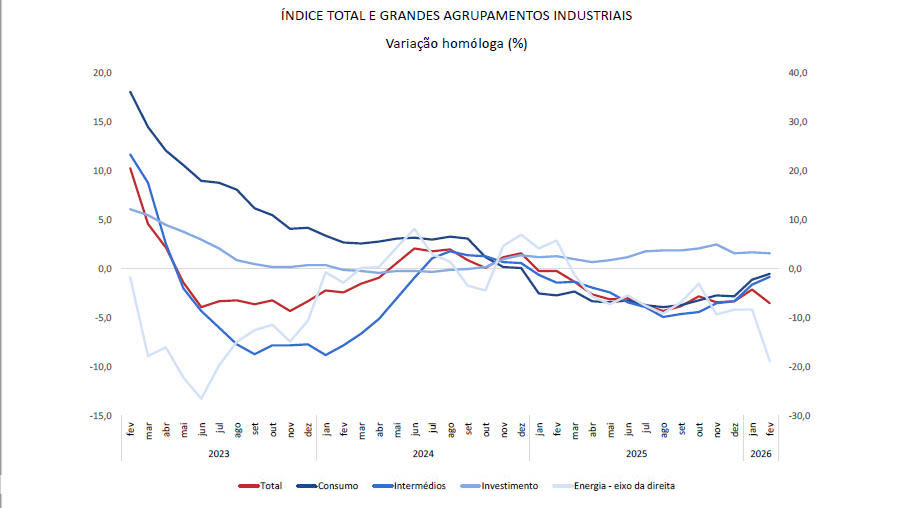 葡萄牙國家統計局於3月18日發布2月工業生產價格指數(IPPI)數據,該指數同比錄得3.5%的跌幅,較1月的2.1%跌幅擴大1.4個百分點,環比則由正轉負下跌1.1%,而2025年2月環比為增長0.3%。能源價格的大幅回落成為拉低整體指數的核心因素,其對整體指數的同比貢獻達-3.3個百分點,成為此次工業生產價格走弱的主要推手。