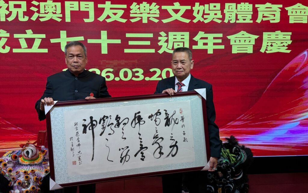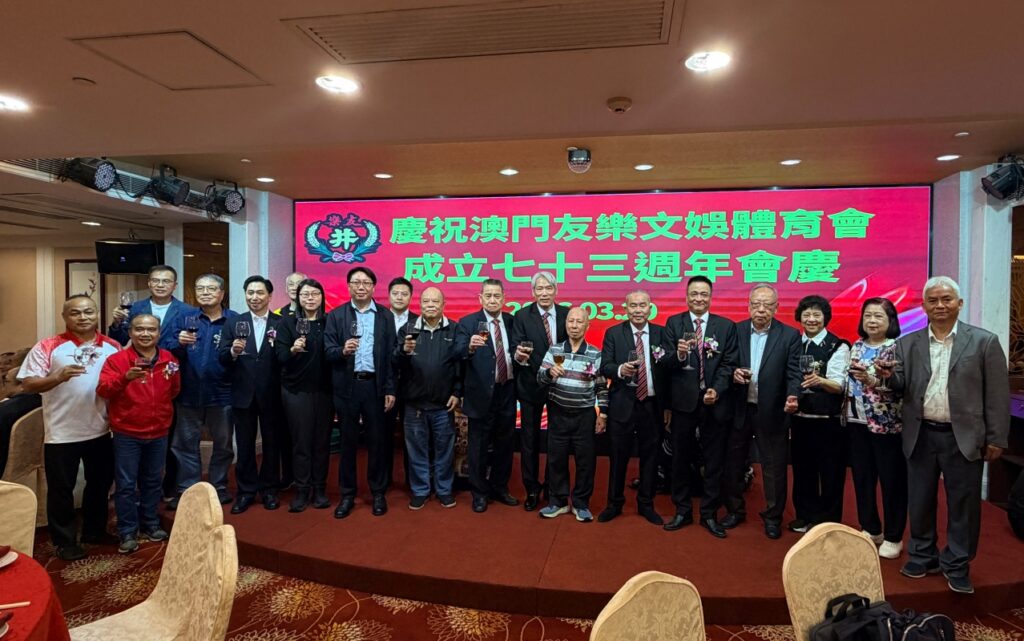 澳門友樂文娛體育會於今(20)日晚在濠璟酒店麗景大酒樓舉行慶祝成立七十三周年會慶聯歡晚宴,會長趙成蔚、總監葉永源、理事長楊有成勉勵全體成員繼續努力,弘揚及傳承中華武術文化,為澳門社會繁榮穩定、慈善公益及體育事業發展貢獻綿力。