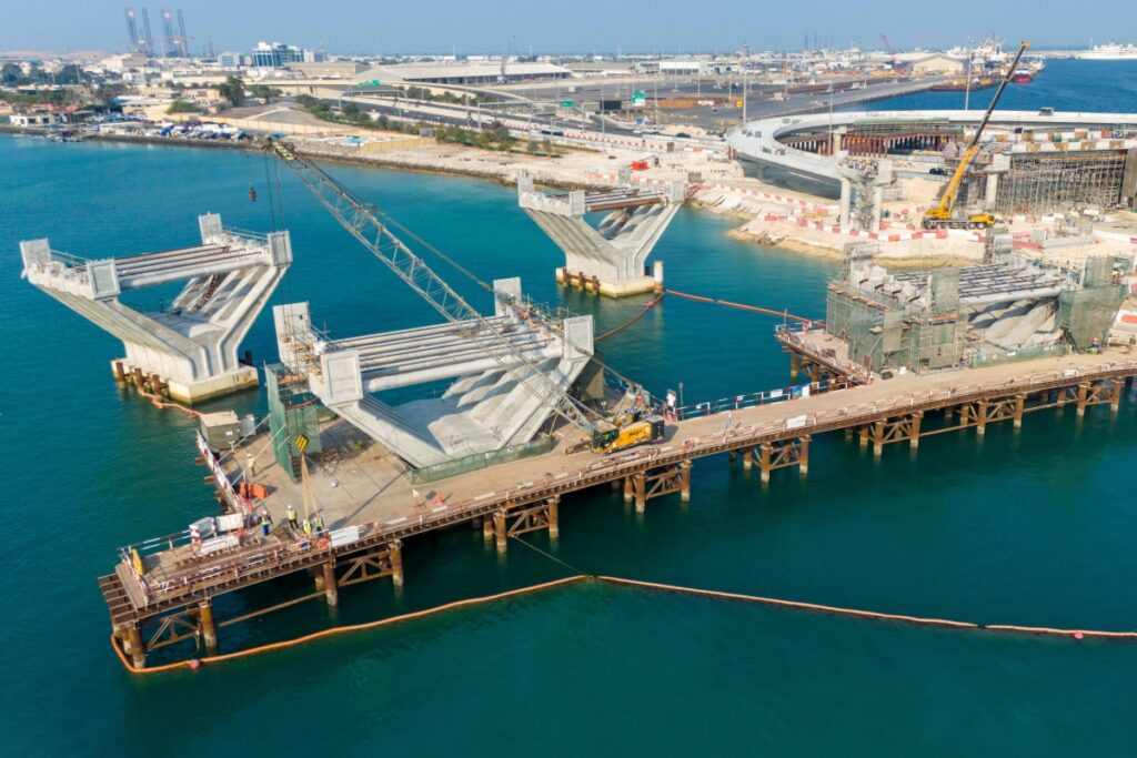 自2023年開工以來,項目團隊面臨波斯灣海域的多重實際挑戰。項目80%施工內容位於海面,需同時應對高溫高濕高鹽霧的惡劣環境,阿布扎比熱季最高氣溫逼近50攝氏度,高空、水上、高溫作業疊加的安全風險持續存在;施工區域毗鄰儒艮、海龜等珍稀海洋生物棲息地,環保管控要求嚴苛;還需滿足阿布扎比質量和合格委員會(ADQCC)當地規範、美國公路與運輸協會標準(AASHTO)等多重國際標準要求,技術融合難度極大。此外,施工區域原有航道承擔阿布扎比部分航運功能,鋼棧橋架設與航道通暢的矛盾,成為項目推進的重要卡點。