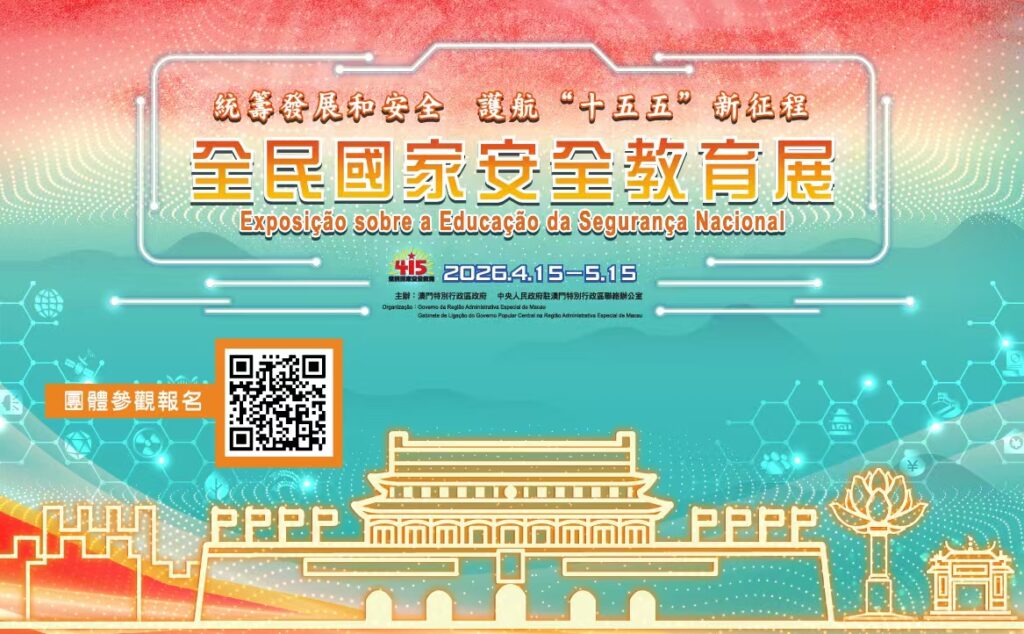 為引領澳門居民深刻感受總體國家安全觀的實踐力量,共同見證澳門與祖國同頻共振、以高水平安全護航高質量發展的堅定步伐,澳門特別行政區政府與中央人民政府駐澳門特別行政區聯絡辦公室今年繼續合辦「全民國家安全教育展」,並定於4月15日下午舉行全民國家安全教育系列活動開幕式暨徵文和短視頻比賽頒獎典禮,「全民國家安全教育展」於翌日(4月16日)下午3時全面開放予公眾參觀。