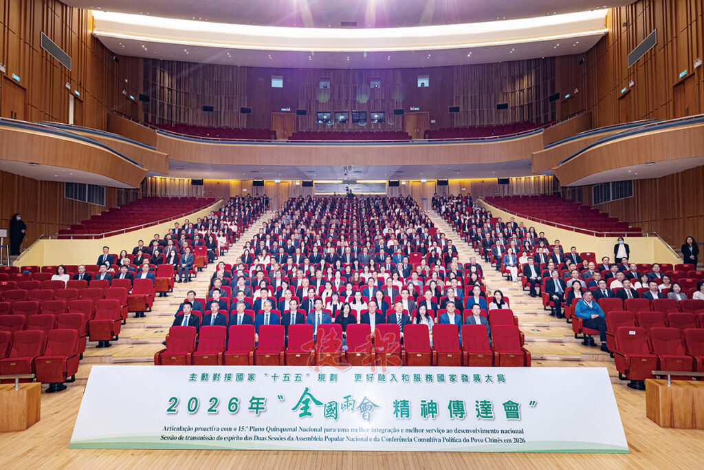為深入學習貫徹2026年全國兩會精神,準確把握國家「十五五」規劃綱要的戰略部署,特區政府昨日在澳門大學會堂舉辦2026年全國兩會精神傳達會,由行政法務司司長黃少澤、中央政府駐澳門聯絡辦公室副主任張應杰、澳區全國人大代表團團長劉藝良和全國政協常委何潤生作專題分享,約450名特區政府領導及主管官員出席。